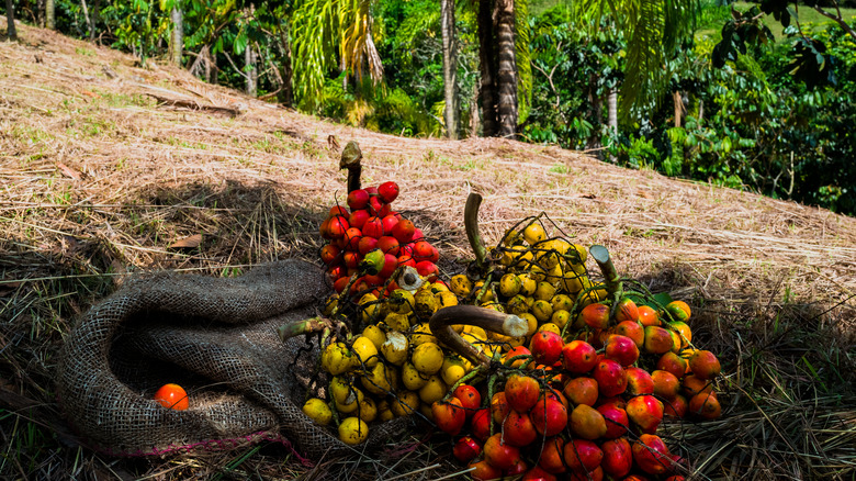 Certain countries, like Colombia, which ranks as the third most biodiverse country on earth (via Greenroofs), have more biodiversity and plants than others and thus have a wide range of fruits available for consumption that are hard to find elsewhere. While Colombians enjoy a ton of fruits native to their land, there is one starchy fruit that is a popular street food that you need to know — the chontaduro.