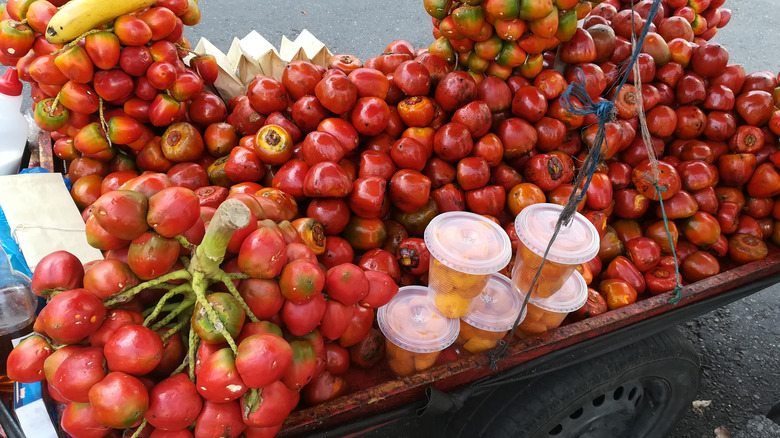 Chontaduro sold as a street snack, is usually boiled for around five hours in salted water (per Colombia Co), and then, the chontaduro is served pre-peeled and cut (via Eat Your World). The fruit is often sold in bags already well-seasoned with salt, lemon, honey, or even milk. These additional acidic and sweet flavorings enhance the taste of the chontaduro fruit itself. If you can get your hands on raw chontaduro, you can prepare them by giving the fruit a good wash and then boil in salted water, though it can also be roasted or baked (via Slow Food Foundation for Biodiversity). Even the seed is edible and tastes like coconut (Speciality Produce).