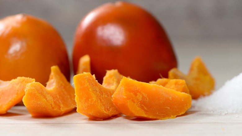 The small chontaduro fruit has smooth skin, which may be slightly wrinkled and a little greasy (via Speciality Produce), and the interior resembles a sweet potato since it is dense, dry, and starchy when raw. Chontaduro is usually cooked before consumption (though, technically, it can be eaten raw though it'll have an acidic taste, per Amigo Foods). Once heat is added, the flesh is most similar to sweet potato. The chontaduro has a large seed inside, and according to one episode of Fierce Fruit, it "tastes like a sweet potato mixed with a nut." Other bloggers like the Open Minded Traveler find the fruit so rich that they've compared eating chontaduro to eating butter, though the texture is relatively dry.