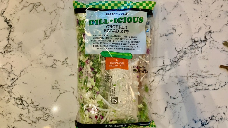 Trader Joe's, the original purveyor of the spice blend that shook the world (Everything But the Bagel Seasoning) is infamous for slapping the flavor profile of one food item onto another and creating a whole new product. It's almost always a smash hit. So why not take dill pickles and run with them? The Dill-icious Chopped Salad Kit is creative, and we have to give major props for how harmonious it is. Every ingredient is right on theme and positively green.