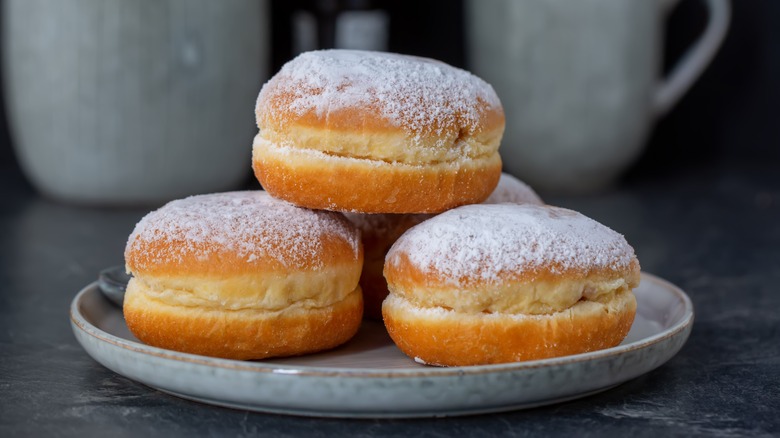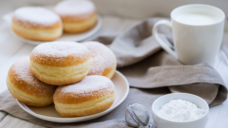 Now, you know when these fasnachts are eaten, but how are they served? According to the Webstaurant Store, a classic way to eat fasnacht is to cut it lengthwise and slather it with butter and maple syrup, much like a sweet sandwich. Fasnachts don't have holes like other kinds of donuts, so any sugary additions stuffed inside won't easily fall out. Another common way to serve fasnachts is to cover them in powdered sugar or granulated sugar, but any way to like them, these German pastries are the perfect way to stuff yourself with all that sugar and fat before fasting.