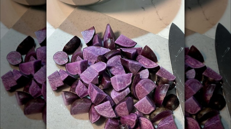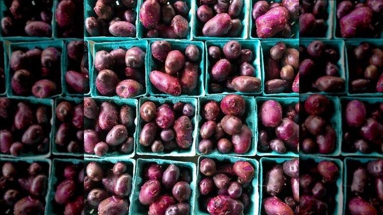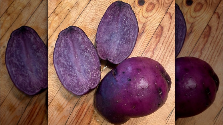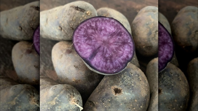 While Adirondack blue potatoes are far from the only purple potato variety, they do stand out as one of the most vibrant — both before and after cooking. Other purple spuds have a tendency to lose pigment once cooked, even taking on a grayish hue, but Adirondack blue potatoes are heralded for how well they retain their color after being boiled, roasted, or fried, per Johnny's Selected Seeds.