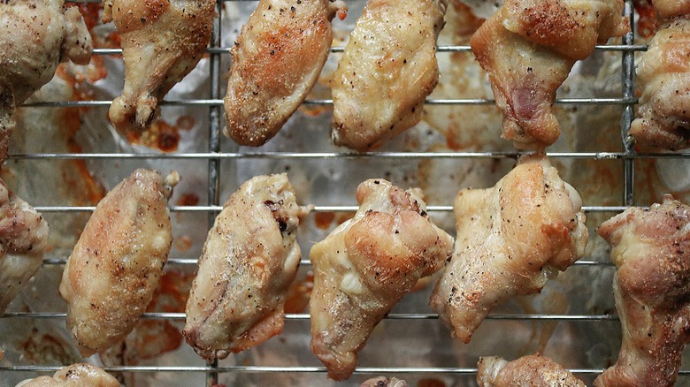 - Line another baking sheet with aluminum foil and place a wire rack on top. Place the seasoned chicken wings on the wire rack leaving space in between each piece of chicken. Do not overcrowd the pan.