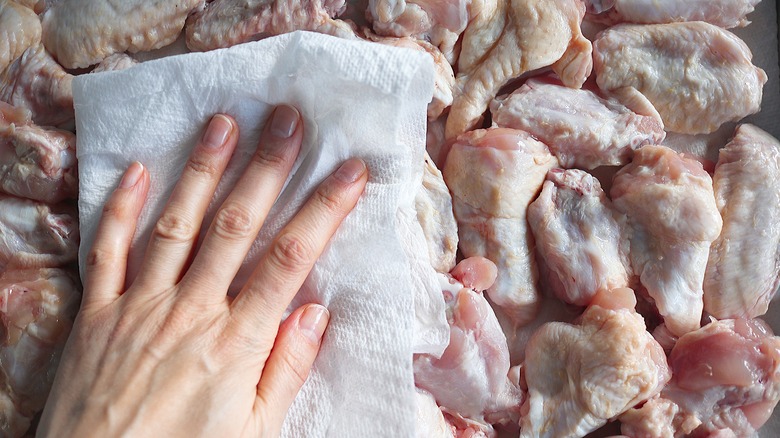 - Place the chicken wings on a baking sheet or tray lined with paper towels. Pat the chicken dry with additional paper towels.