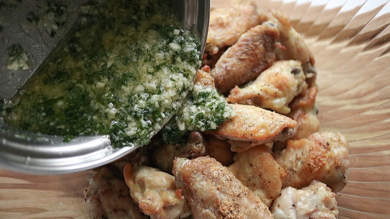Recipe developer Cecilia Ryu is the brains behind this fantastic wing recipe that doesn't skimp out on flavor. "I absolutely love garlic," Ryu raves. "I'm one of those people who, when a recipe calls for 2 cloves of garlic, I double it!" She also explains that the "flavors are identical to garlic bread, so imagine your favorite garlic bread butter sauce poured over crispy baked chicken wings." Yum, yum, and yum! While Ryu does consider these wings to be more of an appetizer, she does note that they could work as a side dish or even a main course. "I will definitely be serving this for my next party," she says. "The Super Bowl would be the perfect!"