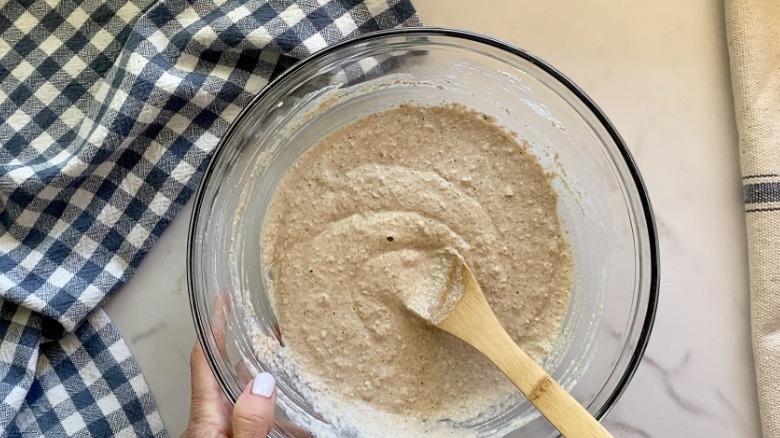 Start by blending the drained cashews and water into a smooth liquid. Pour this into a large bowl, and add 1 ½ tablespoons of the avocado oil, along with the vanilla. Stir to combine, and then add in the dry ingredients. Stir well to combine, and then let it sit for 10 minutes to thicken. "The flax seeds combined with the liquid will act as our egg, and thicken the mixture as it sits," Hahn remarks.