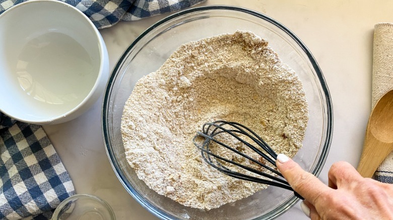 - Put the oats in a small blender, and grind into a fine texture flour. Add this to a medium bowl, along with the ground flax seed, coconut sugar, baking powder, and cinnamon. Whisk to combine.