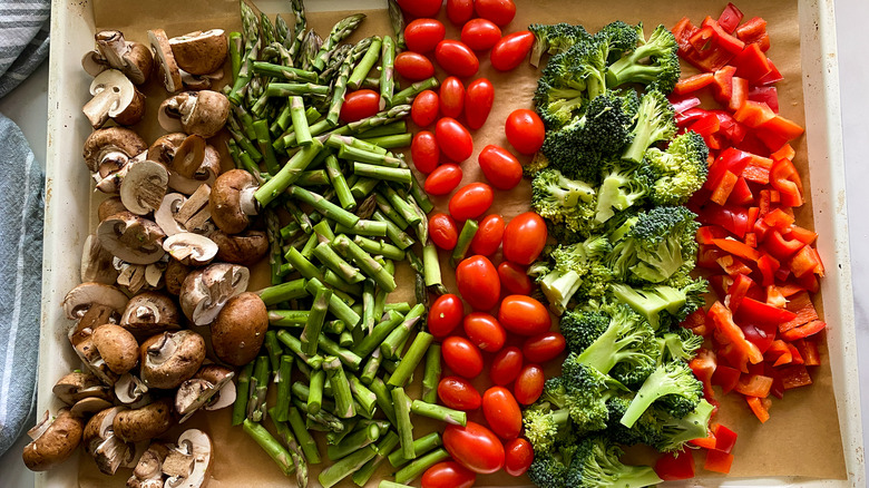 - Add these chopped vegetables to a large baking sheet along with the whole grape tomatoes. Toss on the baking sheet with 1 tablespoon of the oil, ½ teaspoon of the salt, the oregano, and garlic granules. Put these in the oven and bake for 25-30 minutes or until they look browned.