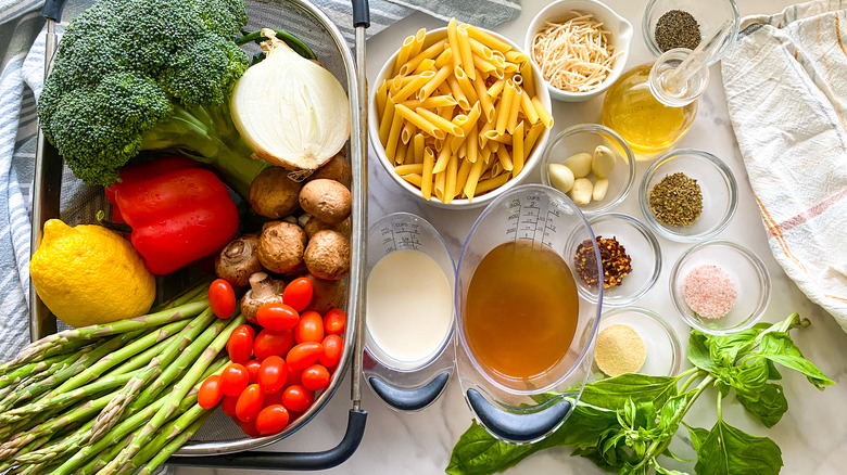 To make this recipe, you'll of course need some pasta. Hahn is using penne but says, "Any type of pasta will be great in this recipe." While you are in the dry good aisle pick up some broth then head to the produce department and grab a red pepper, asparagus, mushrooms, broccoli, grape tomatoes, onion, garlic, lemon, and some fresh basil. You'll also need some basic pantry staples like oil, salt, oregano, garlic granules, and red pepper flakes. A few items in the dairy aisle will round out the list — milk (or cream) and Parmesan. "If you prefer to make this dish vegan, just substitute dairy free milk and dairy free parmesan and it will turn out equally as good," Hahn shares.