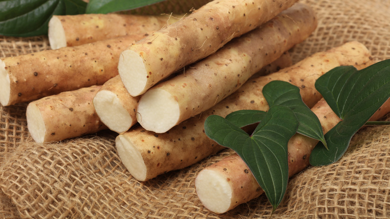 If you're looking for a refreshing yet filling noodle dish, one perfect for a hot summer day, look no further than hiyashi yamakake udon. This chilled dish is easy to throw together in no time and only takes a few ingredients. According to The Spruce Eats, this dish starts with a pack of frozen udon noodles that need to be boiled. Ideally, frozen noodles are best, so they retain their springy texture and cook quickly, as per the site. The dish is also served with grated Japanese mountain yam, sometimes called nagaimo or yamaimo, as per The Spruce Eats. This unique ingredient introduces a satisfyingly sticky texture to the dish. When grated, it piles on top of the noodles like snow, adding a visually appealing element and a subtly sweet flavor among the savory ingredients, according to MasterClass.
