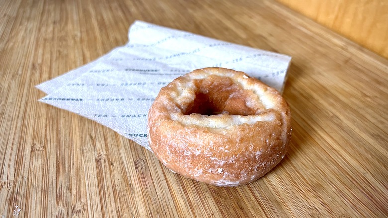 The egg sandwiches are the most beloved breakfast items according to Starbucks regulars, but we've always had a sweet spot for the bakery items. Alongside the bagels, lemon loaf, and croissants is a single doughnut offering — an old-fashioned cake variety glazed with sweet icing. We wondered how it would stack up next to Krispy Kreme's iconic glazed pastries, so we picked up a few and tested the sugary waters.