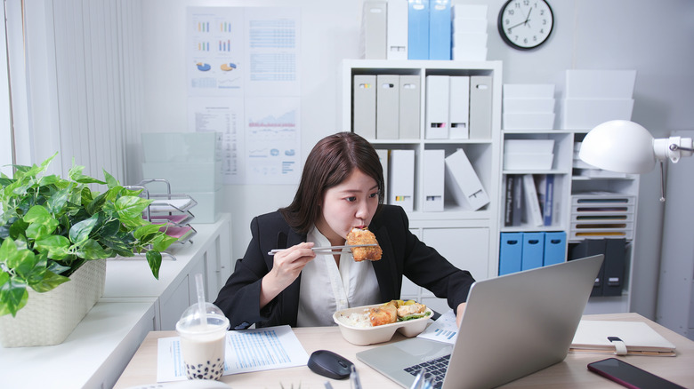While insulated lunch boxes try to maintain foods' temperatures, electric ones are designed to heat up cold food so you can enjoy a warm meal on your lunch break. According to The Spruce Eats, electric lunch boxes either have an internal battery or are meant to be plugged in at your office, and they can warm up your food for anywhere from 30 minutes to two hours. These devices don't cook your food for you but are designed to bring your cold leftover chicken parm, for example, up to temperature while you're plowing through the morning's tasks.