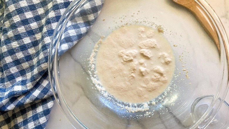 - In a large bowl, combine the warm milk (temperature between 105 and 115 F) and the yeast. Stir lightly, then wait 10 minutes for the mixture to start bubbling.