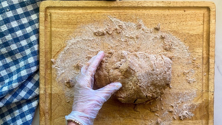 Remove the dough from the bowl, and place it on a large cutting board. Knead the dough for 3 minutes. "The dough will be very dense, and will require some muscle to knead, unlike some breads made with white flour that can be lighter in texture," Hahn remarks.