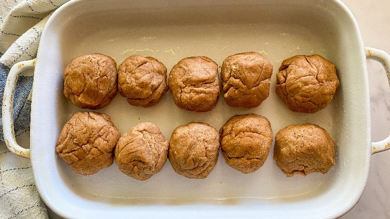 - Place the dough back on the cutting board, and divide into 10 sections. Shape each one into a ball, and place in a 9-x12-inch baking dish that has been sprayed with cooking spray. Cover the baking dish, and let the rolls sit for about 30 minutes. Preheat the oven to 350 F.