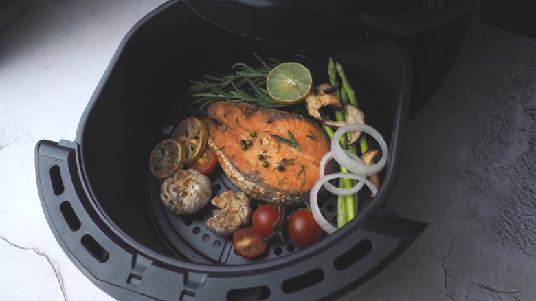 If you're just cooking for yourself or a friend, you may be tempted to throw your whole meal in the air fryer — meat, veggies, and all. It's true that the baskets can technically fit more than one item, but is it possible to cook multiple foods in an air fryer?