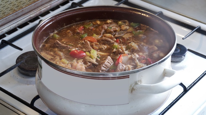 If you've ever made soup at home to warm up during the chilly winter months, you know that many recipes ask you to simmer the pot, sometimes for an hour or more. Recipes like chicken tortilla soup, beef and vegetable stew, and white chili all require the ingredients to cook at a low heat so the flavors can meld together (via Midwest Living). In particular, brothy soups like matzoh ball benefit from a long simmering time, and chicken stock typically needs to simmer for up to eight hours, according to The New York Times.