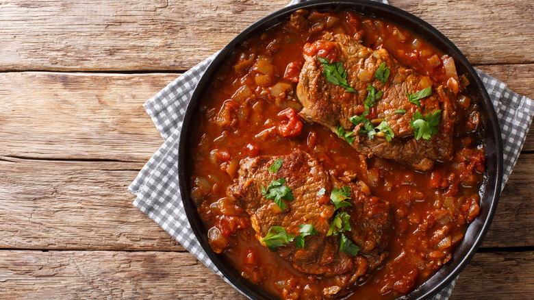 Delighted Cooking reports some of the first references to Swiss steak in American cookbooks date back to the early 20th century. By the mid-1900s, it was commonly featured in family gather-around-the-dinner-table scenes depicted in movies and on television. Wine Lovers Page dug a little deeper into the history of Swiss steak to posit the dish became mainstream during and immediately after WWII as average consumers made choices to stretch their budgets by purchasing cheaper cuts of meat. And, at about the same time, according to Culinary Lore, aluminum foil brand Reynolds gave Swiss steak a boost by running the recipe on its packaging.