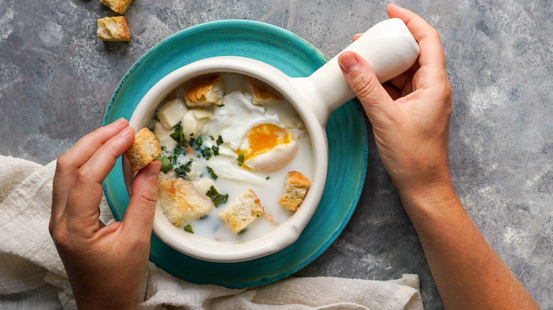 Whole eggs are added once the soup is simmering. As Kenji explains in his video, the eggs with poach in the broth. Finally, as the soup is being served up, some cheese, traditionally a thick, soft cheese called queso pera, is sprinkled in. This is the closest thing to definitively traditional changüa you are likely to find, as multiple variations exist throughout Colombia. As CultureTrip notes, some extra ingredients include potatoes, garlic, and butter, all of which are used to bring added levels of flavor.