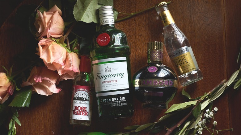 For this cocktail, you'll need rose water, raspberry liqueur, gin, and a sparkling topper of your choice, like tonic water. Rose water is most easily found in the mixers aisle of liquor stores, but can also be found in some grocery stores that sell specialty drink products. Don't leave the grocery section for this, as skincare products will have other ingredients not made for consumption. If you're really stumped, try searching online for edible rose water, or swap for elderflower liqueur.