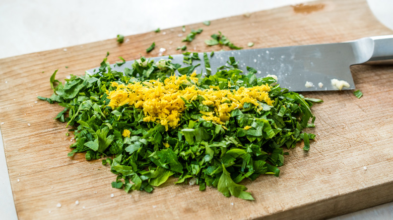 To avoid this more undesirable outcome, make sure to chop both your parsley and garlic with a sharp knife. We know doing this by hand might be slightly more time consuming, but it will still take under 10 minutes to prep, as per Simply Recipes. Once you take time to mince the garlic and finely chop the herb, you can grate the lemon zest. Then, mix your ingredients together in a bowl and spoon over your meat. See, it's still simple even without your loyal food processor! You can also add salt and pepper to taste, and you're ready to enjoy.