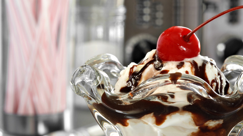 Swirled with syrupy sauce, topped with a bouffant of whipped cream, and crowned with a cherry — the ice cream sundae might not be humanity's most practical invention, but it's arguably its most delightful. If you're lucky, a good sundae will carry you off on a candied boat to a carnival land of sugared whimsy, where all is well and good for a while. And from that first bite of the cherry to the last spoonful of gloopy ice cream, finishing one is both satisfying and poignant.