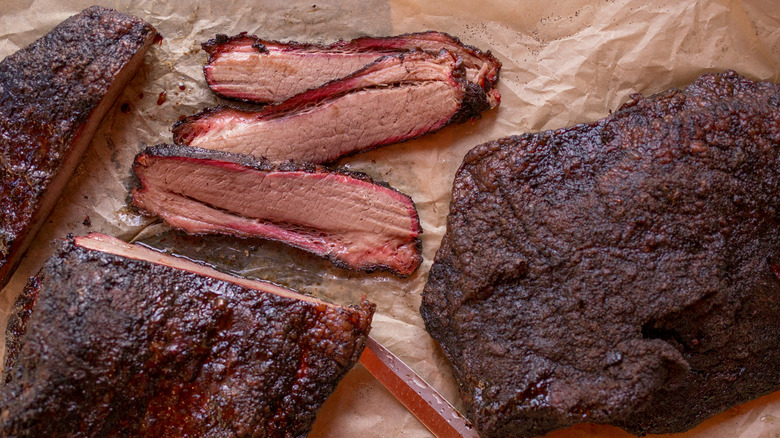 Burnt ends actually originated at a restaurant in Kansas City called Arthur Bryant's BBQ (per Kansas City PBS). Legend has it that the sandwich makers there would cut off the more charred ends of the briskets' point end as they were accessing the flat. As they trimmed the brisket, the scraps would pile up, so to give their customers something to nibble on while they waited in line to order, the burnt ends were set on the counter as a sort of free sample. After a while, they became so popular that customers requested they be on the menu. (per Kansas City PBS).