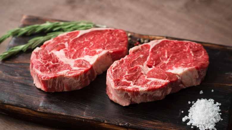 Cheesesteaks have a filling, working-class image that would make you assume the meat used is on the cheaper side, but that's not the case. According to First We Feast, the cut most cheesesteak makers prefer is the nicer, more expensive ribeye. The ribeye is sliced thin, but not too thin, and griddled on a flattop, where it's chopped with a spatula to break it down into bite-sized pieces. The end result is something you might not recognize as ribeye but brings the kind of fat and flavor needed to hold up to half a gallon of cheese whiz.