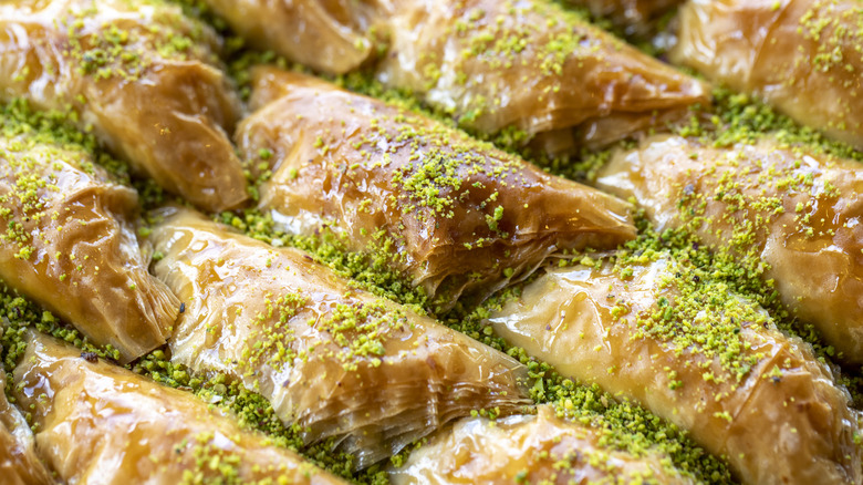 Now, if you know your way around baklava, you'll know that it can use a few different kinds of nuts to make, but the most popular kind in Turkey, and especially in Gaziantep, is pistachio baklava, characterized by their sugared, golden filo, and vibrant green filling. Baklava was originally a Turkish delicacy, but today it is enjoyed in several Mediterranean and Middle Eastern countries. Jungle Jim's explains that baklava dates all the way back to the 11th century C.E. when nomadic Turks began to layer and pleat their bread and from that practice. From there, the sweet pastry we know and love today evolved. Modern sweet baklava is sometimes thought to have been popularized by a sultan of the Ottoman Empire, Suleiman the Magnificent, and became a well-beloved treat amongst his military.