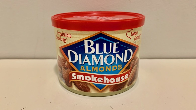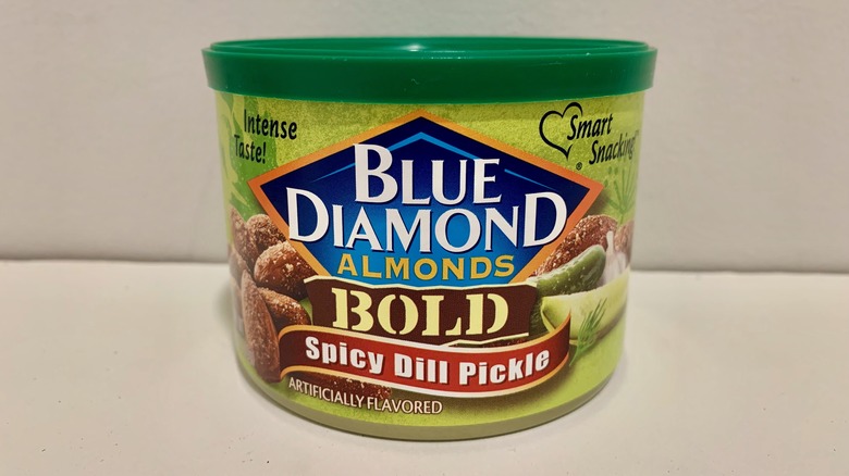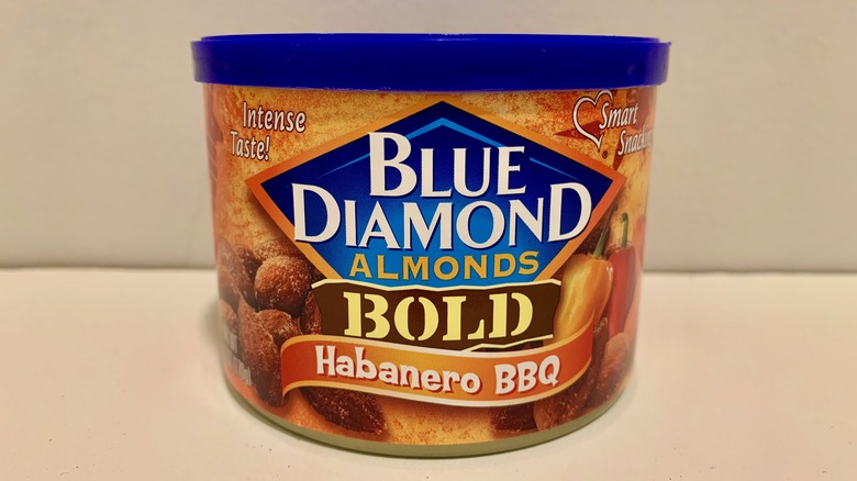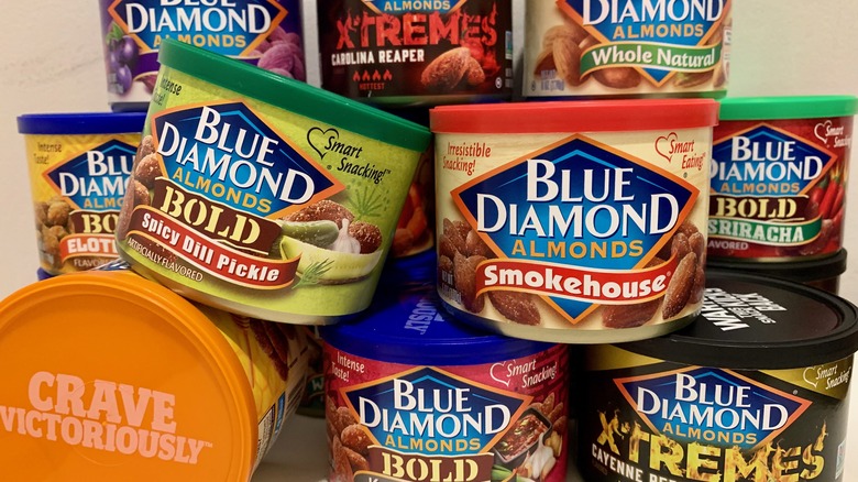 Okay, we promise that was the first and last time we will make that ridiculously obvious pun. What we're actually here to do is rank the best flavors of Blue Diamond snack almonds. Packaged in convenient and colorful little tubs, they are delightfully easy to eat and come in a wide array of innovative flavors, from classy basics like Honey Roasted to wild Carolina Reaper Xtremes.