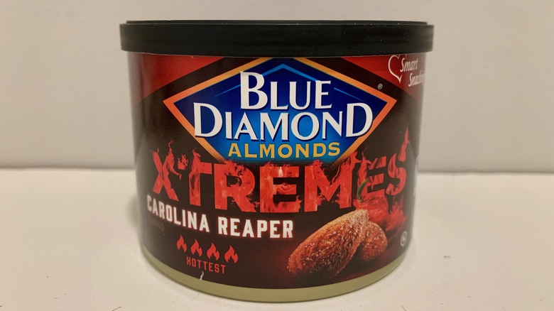 The first ingredient is almonds. The second ingredient is Carolina Reaper Seasoning. The nuts cut right to the chase, and you can smell the commitment as soon as you pop open a can. This is the pepper that earns four out of four flames. These are the almonds that Blue Diamond promotes as really earning the Xtreme label, the spiciest flavor they can hit you with. Do they live up to the promise?