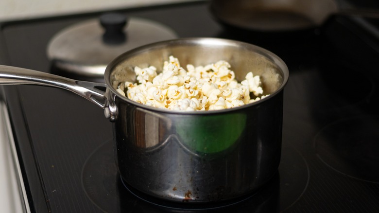 The pot needs to have a lid, too, per Taste of Home, to help to keep the kernels contained as they pop. Speaking of kernels, have a pot deep enough and wide enough that the kernels will be able to be surrounded by the hot oil. You may also want to stay away from a pot that is too heavy because you'll need to remove the pot from the heat as the kernels begin to pop and then shake it for three seconds before returning to the heat, according to The Pioneer Woman. This process should continue until the popping slows down. All that is left is to sprinkle with salt and enjoy like the Ferris wheel is turning behind you.