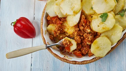 Croatian moussaka features layers of potatoes, ground meat, and an eggy custard