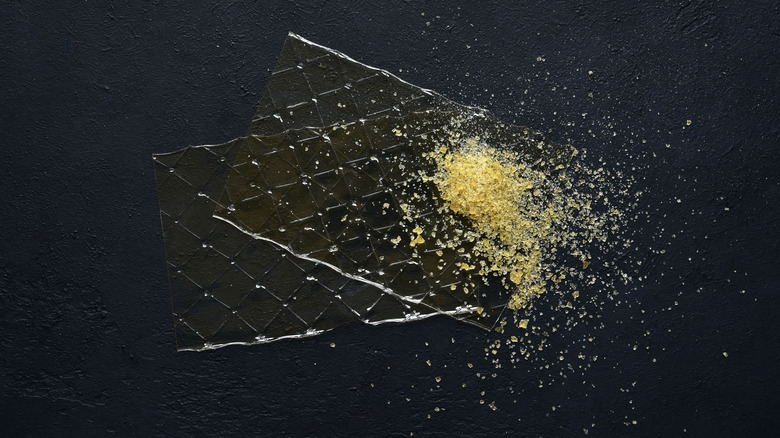Gelatin is made from the collagen that is found naturally in the bones and connective tissues (like ligaments and tendons) of animals like cows and pigs, explains Livestrong. Traditionally made by simmering animal bones for hours until the collagen has been extracted, there is a convenient shortcut — packaged gelatin, which comes in both powdered and sheet form. Although similar, there are some differences between sheet and powdered gelatin: powdered gelatin is easier to measure out and dissolves more quickly while sheet gelatin is more transparent, with less of an aftertaste.