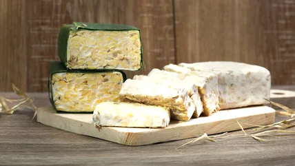 Traditionally, the mixture is wrapped in banana leaves or plastic bags for one to two days — however long it takes for the white mushroom mycelium to bond with the soybeans and form a compact cake. Not only does the fermentation process give tempeh its multi-dimensional flavor, but also its fibrous texture. The resulting product looks similar to a block of tofu but denser and with a visible network of split soybeans and white fibers. In Indonesia, the tempeh is sold fresh in morning markets just like that, banana leaf and all. The tempeh you'll find in the store, however, is typically frozen prior to being packaged and shipped for ultimate freshness.