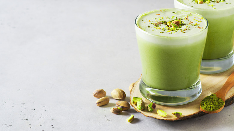 According to one report from Well + Good, it takes less water to grow pistachios than it does to grow almonds, which makes pistachio milk better for the environment. Taché, a recently launched pistachio milk brand, was founded by Roxana Saidi, who grew up snacking on the distinctively green nut and wanted to turn her favorite snack into a delicious milk drink (per One Green Planet).