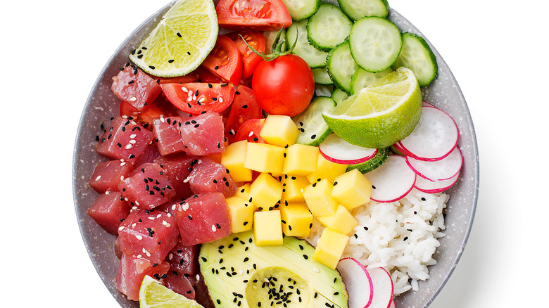 Poke bowls are rooted in Hawaiian culture thanks to a dish originally made by indigenous Polynesians, notes Michelin Guide. Poke originally consisted of raw fish caught on nearby reefs that were then cured and flavored with whatever was available, like sea salt, seaweed, algae, or nuts. In modern times, the main protein found in poke has shifted to ahi tuna as fishing boats trolled farther out from the shore. This species thrives in deep, warm tropical waters, like those surrounding Hawaii and Central America, says Crowd Cow. Ahi tuna is a versatile meat served raw for sushi, grilled, seared, or baked. The flesh starts a dark pink before turning white as it cooks.