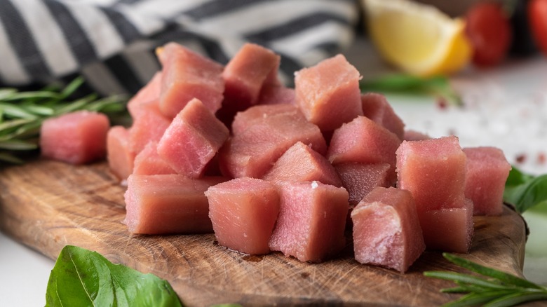 For poke, ahi tuna (yellowfin) is served raw for contemporary Hawaiian cuisine, according to Food & Wine. One key to great-tasting poke is to find the freshest fish you can. If your local fish market doesn't have ahi tuna, consider other tuna species, fatty fishes like salmon, red snapper, halibut, or sea bass, which can act as a worthy substitute. How large you cube your chosen fish is another tip to make a fantastic presentation for bite-sized morsels when making poke at home.