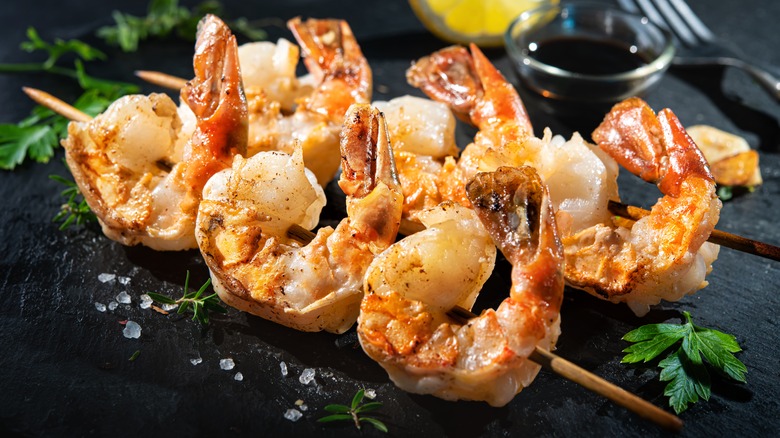 For charred, crispy shrimp, Bon Appétit recommends leaving a bit of space between each shrimp on the skewer. For juicier, less flame-kissed ones, you can push the shrimp close together. Just don't be tempted to thread any veggies on there, The Spruce Eats notes. Produce cooks a lot slower than shrimp, so you'd be left with cooked seafood and underdone veggies. Instead, skewer your chunks of veg separately, so you can throw them on a few minutes before the shrimp.