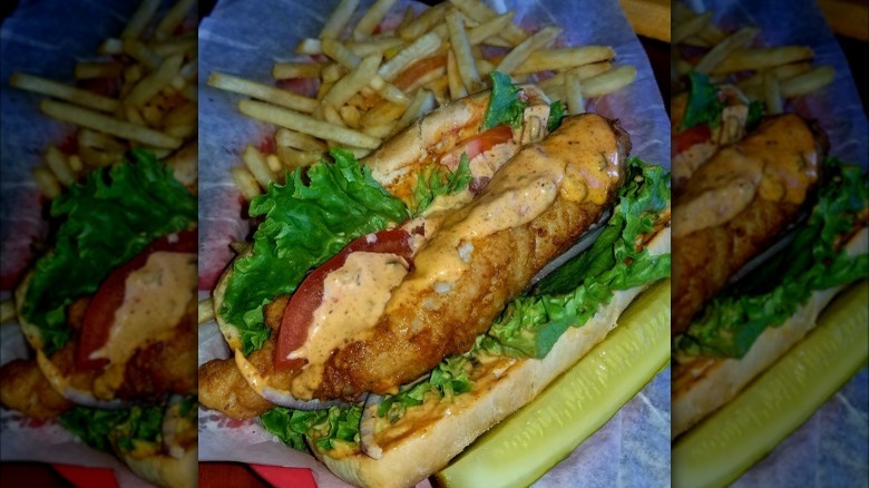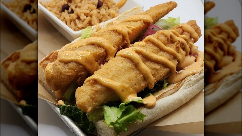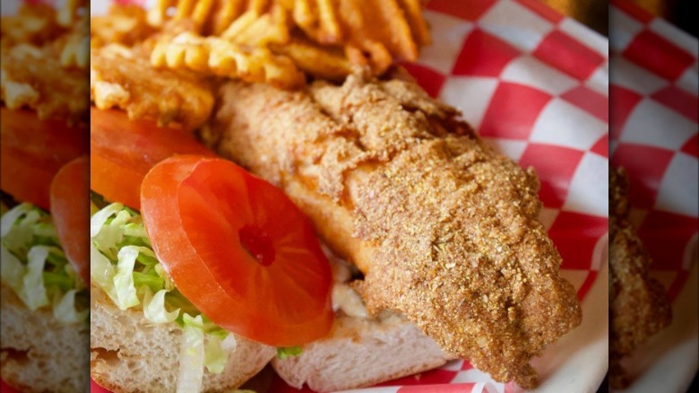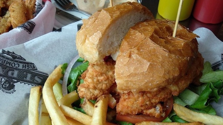 While we love fresh oysters and exclusive brews, the Catfish Po'boy here is next level. You can choose to get this one fried or blackened; both are delicious. Alongside your fish, your bread gets tarter sauce and veggies. We think this catfish is perfectly fried, and we loved the breading as well. Since many fried sandwiches use cod as the fish of choice, we found catfish to be a delicious change. For your fries, you'll get to choose between Cajun and regular fries. The Cajun makes sense if you're getting blackened catfish, and regular fries probably work best for fried catfish.