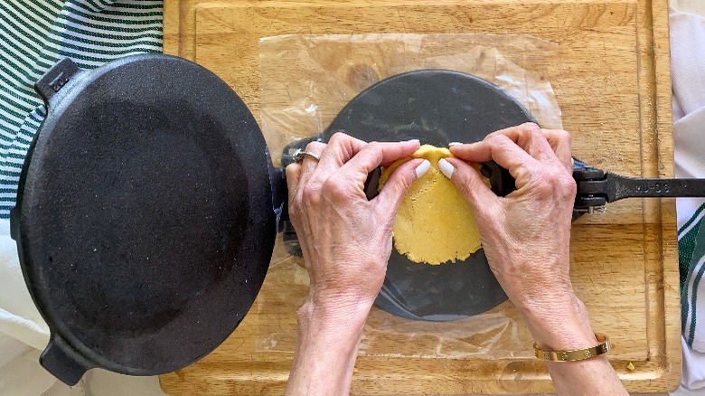 After the dough has rested, divide it into 12 equal parts, roll each part into a ball, and flatten each ball into a 5-inch-wide circle. You can do this by hand, or with a tortilla press. "If you are using a tortilla press, be careful not to press down too hard. The sopes are much thicker than a standard tortilla. We want them to be at least ¼-inch [thick]," Hahn remarks. After you flatten the sopes, pinch the outer edges up to create a rimmed border. Lay them out on 2 large baking sheets that have been lined with parchment paper, and bake in the oven for 5 minutes.