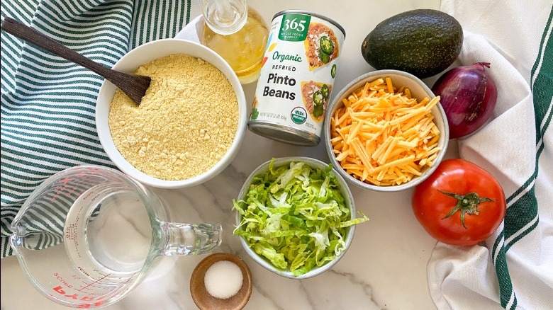 To make this recipe, the main ingredient is masa harina, so pick up some of that in the dry goods aisle. You'll also need salt, olive oil, water, and refried beans. "To keep this vegetarian, check the ingredients on the refried beans to make sure they don't contain animal fat," Hahn tells us, or you can make homemade refried beans. In the produce aisle, pick up some shredded lettuce, tomato, onion, avocado, and finally, some shredded cheese from the dairy section. "To make [this] vegan, just use dairy-free cheese," Hahn remarks.