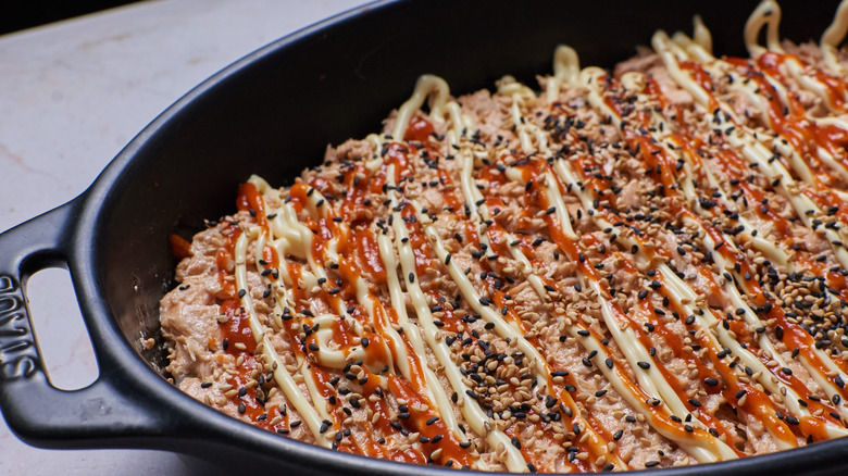 "My word of advice: anything fresh should be added after baking, like avocado slices, cucumber, and radishes," McGlinn advises. "Otherwise, throw it on beforehand — even sauces." As for specific additions, she suggests adding asparagus to the dish, but be sure to do so before baking. After-baking toppings can include fish roe, carrots, or edamame. You can add these extra toppings in addition to the ones the recipe already calls for, or you can switch them out as desired until you've discovered your perfect, fully customized sushi bake.