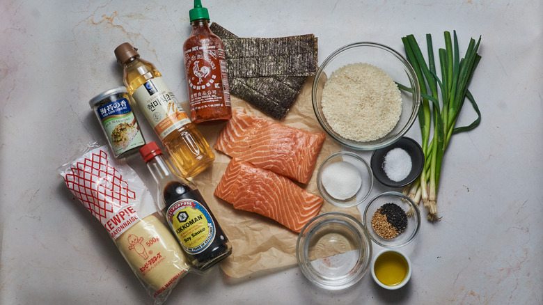 For this particular recipe, you will need salmon filets, olive oil, soy sauce, Kewpie mayo, sushi rice, water, rice vinegar, sugar, salt, furikake seasoning, sriracha hot sauce, white sesame seeds, black sesame seeds, scallions, and nori sheets.