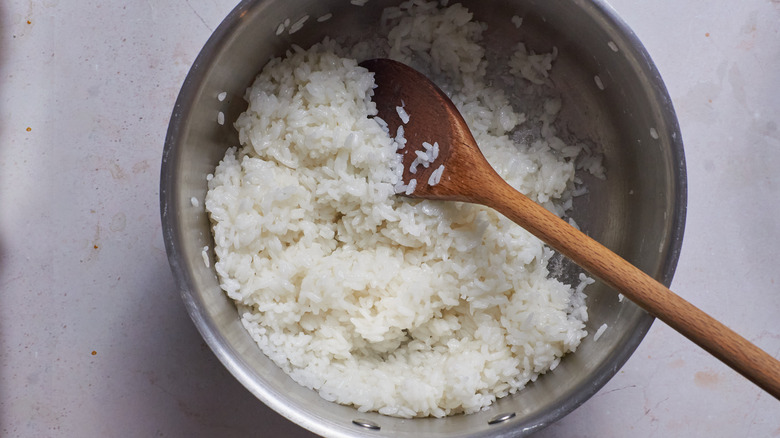 - Whisk the vinegar, sugar, and salt together in a medium-sized bowl. Add the cooked rice and furikake, and combine.