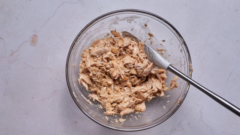 Remove the salmon from the oven, and use a fork to shred it. Once it's shredded, add the salmon to a bowl, and mix it with the soy sauce and 2 tablespoons of Kewpie mayo. Combine well, then set the mixture aside.