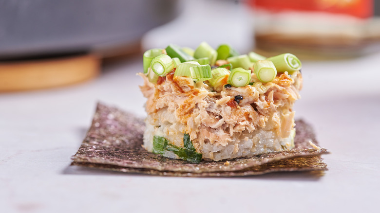 Recipe developer Michelle McGlinn is the brains behind this killer sushi bake that's great for an easy dinner with family or friends. "This recipe [is] made from scratch, [and] completely fresh," she shares. "The original idea [behind] this casserole was to [find] a way to use up leftovers. The cook time gets cut in half if you have leftover rice and salmon, making it a super quick recipe. I love sushi, but making sushi homemade is difficult and time consuming. It is definitely fun if you have the time and energy, but for a weeknight craving, this sushi bake is a perfect compromise," McGlinn explains. "I also love the idea of this as an appetizer with wonton chips — I love anything dippable, and this is creamy enough to be perfect for that. I love that this makes sushi easy." Keep reading to find out how to make this easy sushi bake recipe.