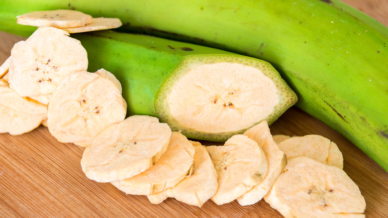 Since green plantains have a much tougher texture than sweet plantains, it's important to get the cooking technique just right when cooking the green plantains for mofongo. To make the plantains soft you have to fry them in oil, but you want to be sure to fry them gently, so they don't burn and create a hard and dry texture in the dish, notes The New York Times. Once the plantains are fried you'll begin to assemble the dish inside of a pilón — which is a small wooden bowl similar to a mortar and pestle — and smash everything down together. Layers of fried plantains, chopped garlic in oil and the chicharrón are combined in the pilón until it's filled and compacted down tightly. Then the dish is gently removed from the pilón and served on a plate in a nice mound-shape.