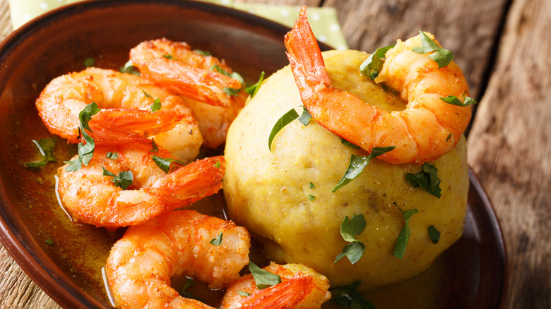 If you've spent any time in Puerto Rico or are well-versed in Puerto Rican food, then you may have tried mofongo. This classic Puerto Rican staple offers a symphony of flavors and textures that are emblematic of the Caribbean islands. According to Smithsonian Magazine, while mofongo is considered to be a traditional Puerto Rican dish, the inspiration and technique may have traveled across the sea when enslaved West Africans were brought to the Caribbean. The traditional West African dish that may have pre-dated mofongo was called "fufu," which was constructed by mashing plantains and cassava yams with a mortar and pestle. After a while these flavors and techniques were blended with Spanish flavors and the new creation was mofongo. Smithsonian Magazine also notes that the word "mofongo" may be derived from an Angolan Kikongo word "mfwenge-mfwenge" which translates roughly to, "a great amount of anything at all." This translation makes a lot of sense when you consider what mofongo is made.