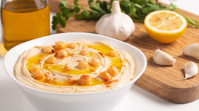 The most traditional simple, creamy hummus is made using just a handful of ingredients (chickpeas, tahini, lemon juice, garlic, olive oil, and salt). Somehow, blending together these basic pieces leads to a velvety bowl of delicious dip that manages to be tangy, garlicky, and nutty all at once. If you're short on tahini or just want to try a new take on classic hummus, pistachio butter is a fantastic substitute. The nut butter has a similar consistency to tahini, so no additional blending or processing is needed, and while sesame seeds have a different flavor profile than pistachios, they both have an earthy, nutty, and delicate taste.